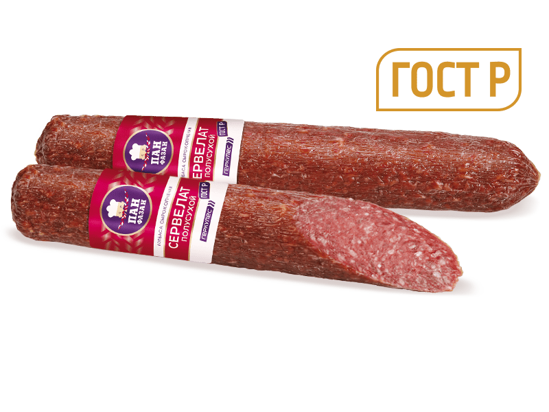 Колбаса сырокопченая "Сервелат полусухой" Колбаса сырокопченая "Сервелат полусухой" изготавливается по ГОСТу из свиной грудинки, говядины высшего сорта, нежирной свинины и чёрного молотого перца. Благодаря изысканному вкусу и выразительному аромату, "Сервелат полусухой" заслуженно относится к категории премиум! А, ГОСТ фиброуз вакуум 180 суток / 90 суток 0..+6 0,28 / 0,13 кг 2310 кДж (560 ккал) 53 г 21 г 0,3 г грудинка свиная, говядина, свинина, нитритно-посолочная смесь, перец черный молотый.