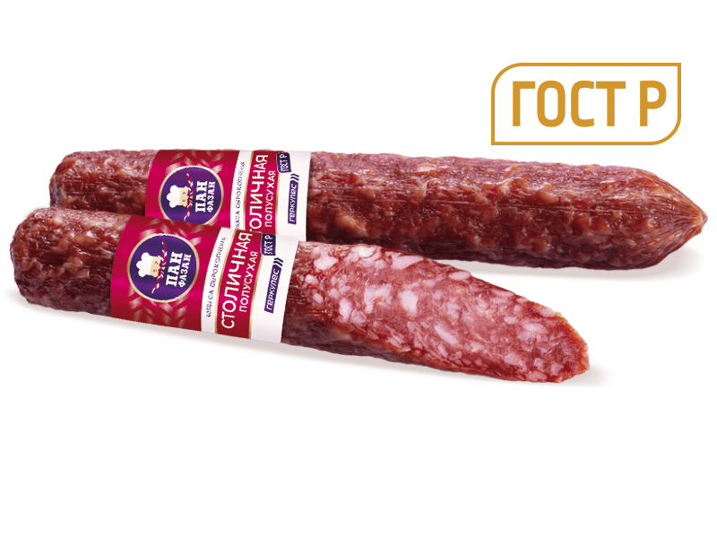 Колбаса сырокопченая "Столичная полусухая" Колбаса "Столичная полусухая" – это мясной деликатесный продукт премиум-класса! Изготавливается по классической рецептуре согласно ГОСТу из говядины высшего сорта, нежирной свинины и шпика. Обладает изысканным вкусом и утончённым ароматом, который придают ей коньяк и букет специй: душистый и черный перец, а также мускатный орех. А, ГОСТ фиброуз вакуум 180 суток / 90 суток 0..+6 0,33 / 0,15 кг 2180 кДж (530 ккал) 50 г 18 г 0,3 г говядина, свинина, шпик, нитритно-посолочная смесь, коньяк, перец черный молотый, перец душистый молотый, мускатный орех молотый.