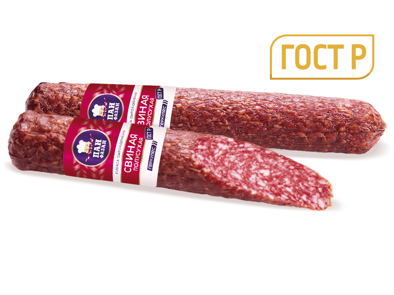Колбаса сырокопченая "Свиная полусухая" Колбаса "Свиная полусухая" — это мясной продукт премиум-класса, изготовленный по традиционной технологии согласно ГОСТу из свиной грудинки и нежирной свинины. Копчение на буковой щепе и натуральные специи придают продукту насыщенный аромат и благородный вкус. Добавление коньяка придает колбасе особый тонкий аромат, а чеснок добавляет приятную пикантную ноту. Б, ГОСТ фиброуз вакуум 180 суток / 90 суток 0..+6 0,29 / 0,14 кг 2370 кДж (570 ккал) 56 г 18 г 0,2 г грудинка свиная, свинина, нитритно-посолочная смесь, коньяк, перец черный молотый, экстракт чеснока.